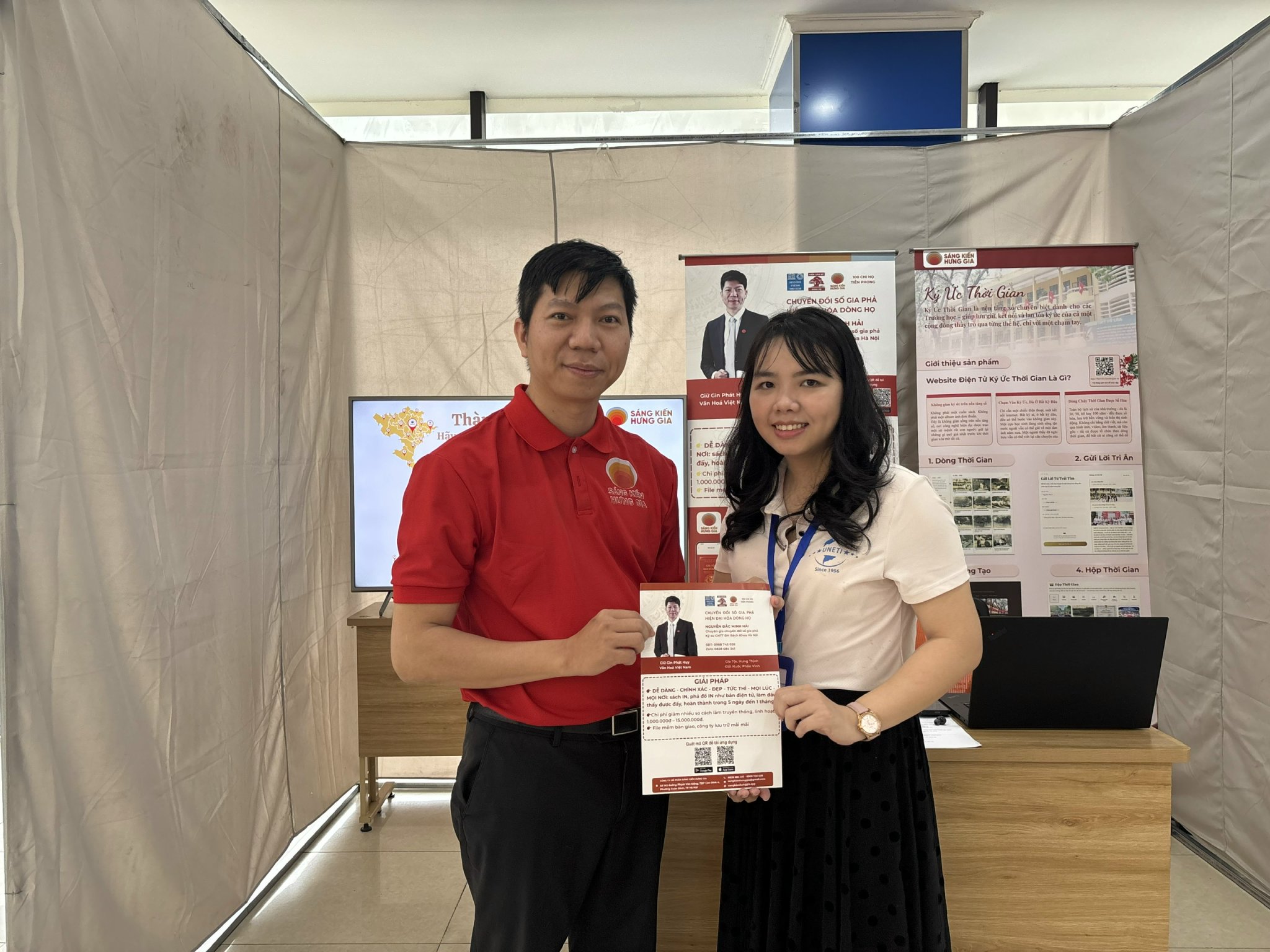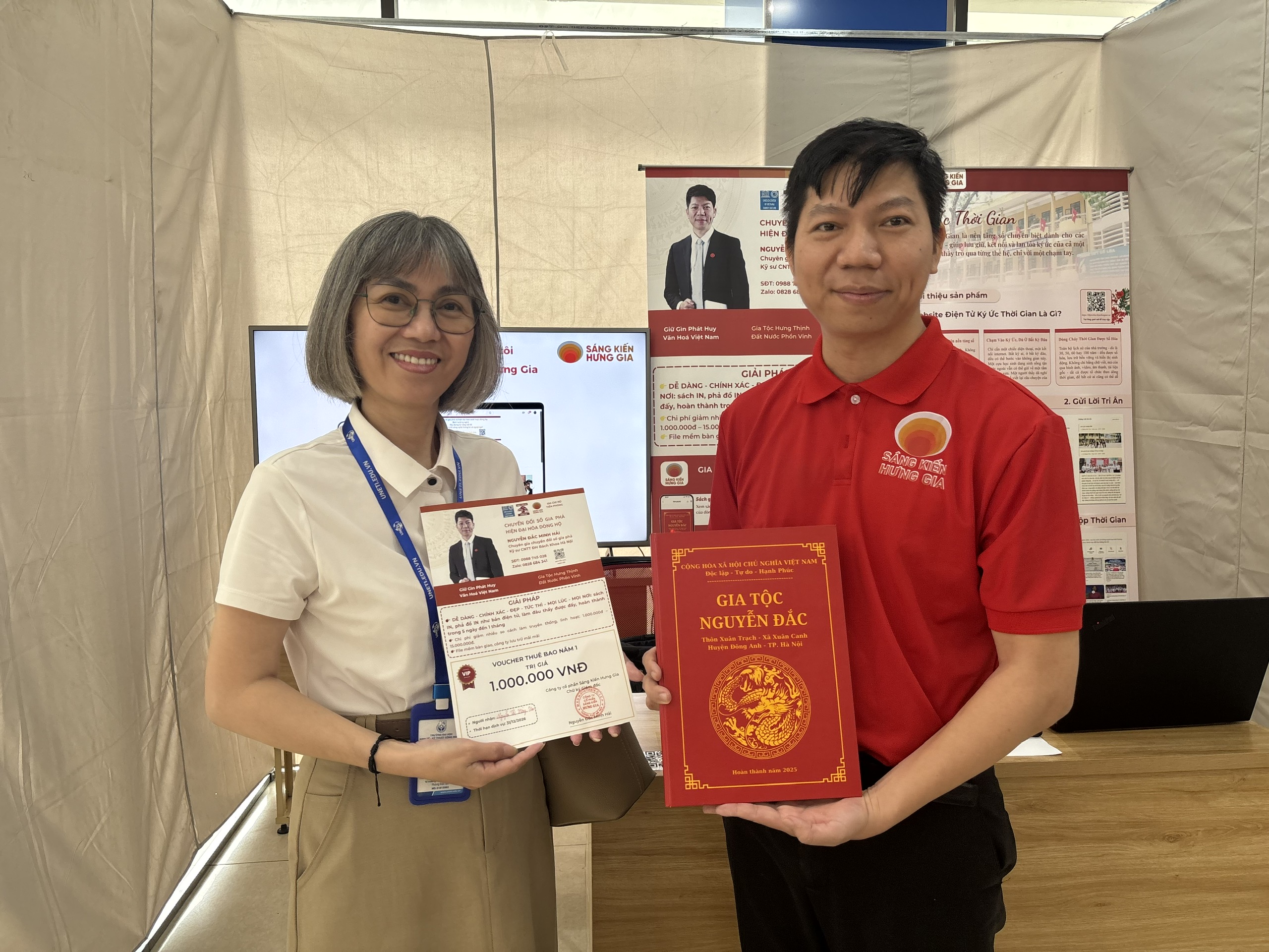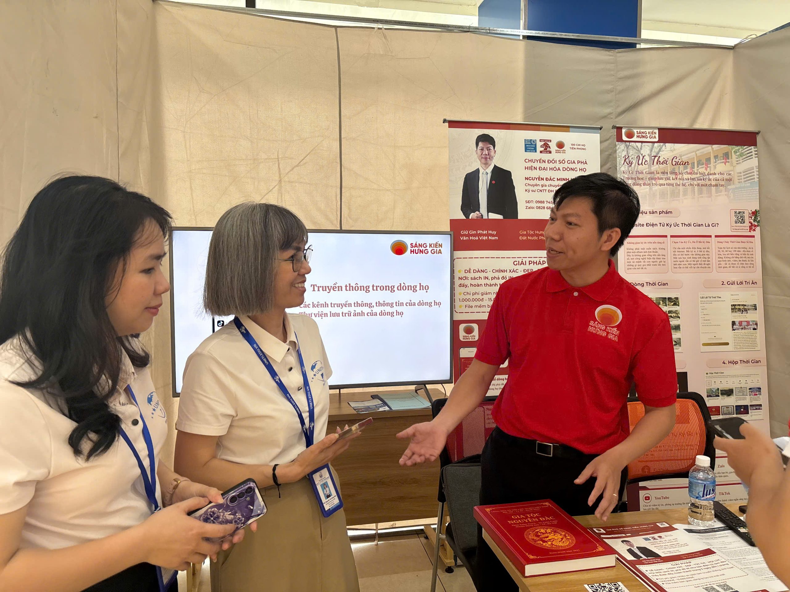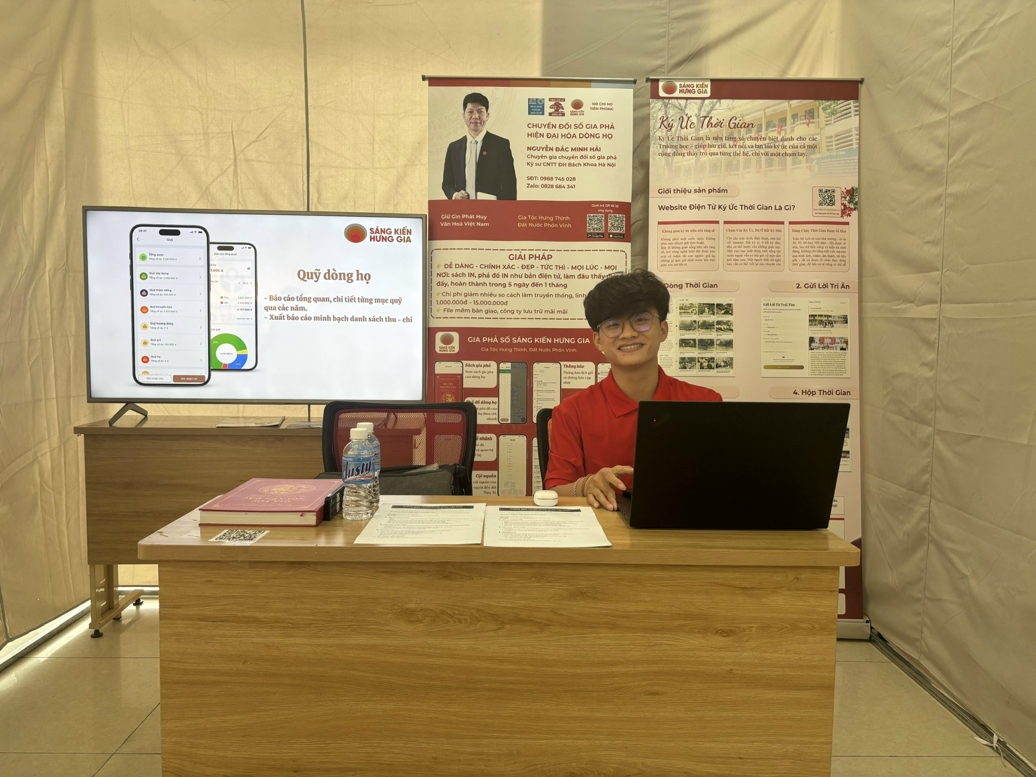 Gian hàng của Sáng Kiến Hưng Gia thu hút đông đảo sinh viên, giảng viên và khách tham quan nhờ cách bài trí chuyên nghiệp, nội dung giới thiệu rõ ràng và đội ngũ nhân sự nhiệt huyết. Tại đây, công ty đã giới thiệu các doanh nghiệp trọng tâm trong lĩnh vực chuyển đổi số, nổi bật là giải pháp chuyển đổi số cho dòng họ – gia phả số và chuyển đổi số cho nhà trường – nền tảng “Ký ức thời gian”.